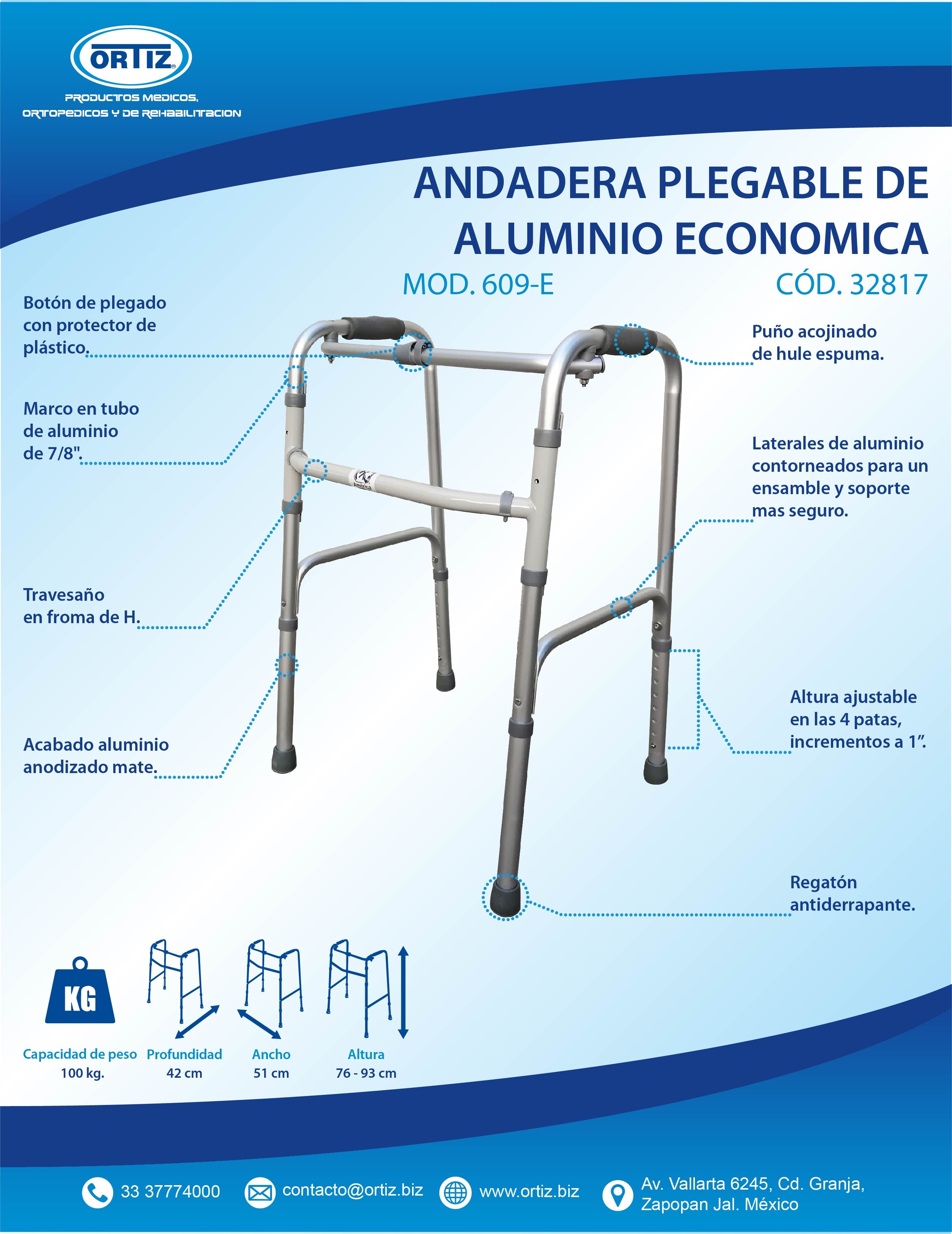Con un peso máximo soportado de 100 kg, este modelo 609E de Ortiz brinda estabilidad y seguridad al usuario. Aunque no cuenta con canasta, frenos ni asiento, su simplicidad la convierte en una opción práctica y funcional. Con esta andadera, podrás moverte con confianza y comodidad, mejorando tu movilidad y calidad de vida. ¡No esperes más y adquiere la tuya hoy mismo!