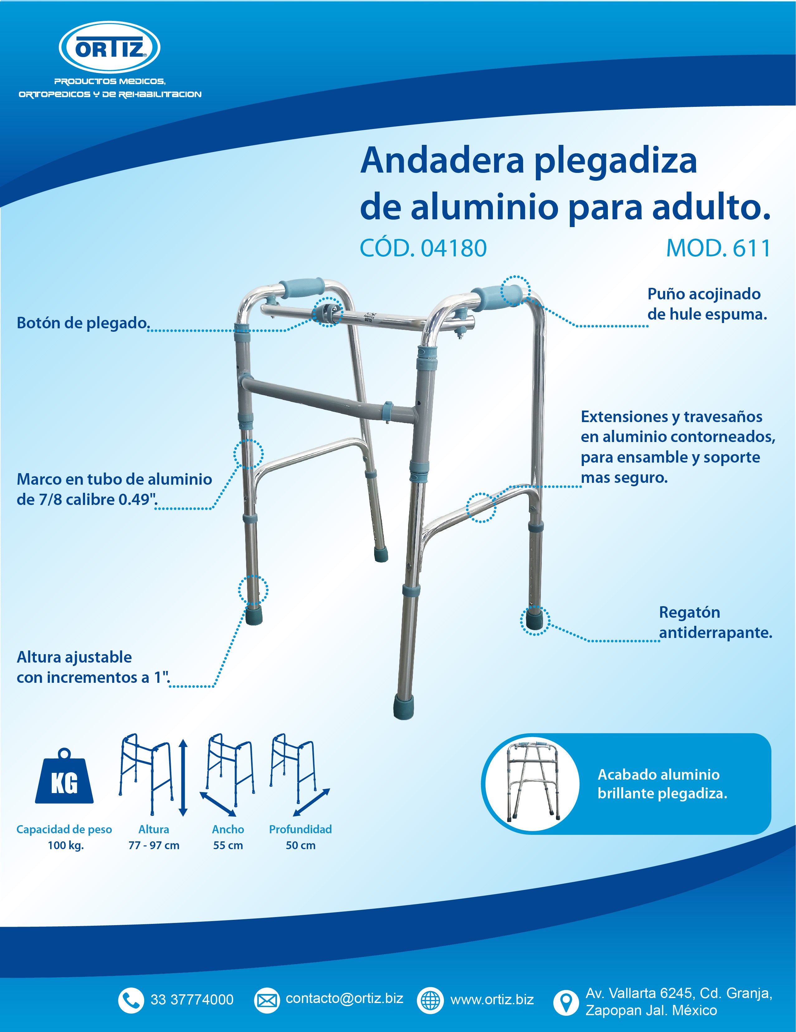 La Andadera Adulto Plegadiza Lujo Premium Alum Brillosa Ortiz es el aliado perfecto para aquellos que buscan comodidad y seguridad al caminar. Con su diseño plegable y altura ajustable, se adapta a las necesidades de cada usuario. Su estructura resistente soporta hasta 100 kg, brindando estabilidad y confianza en cada paso.