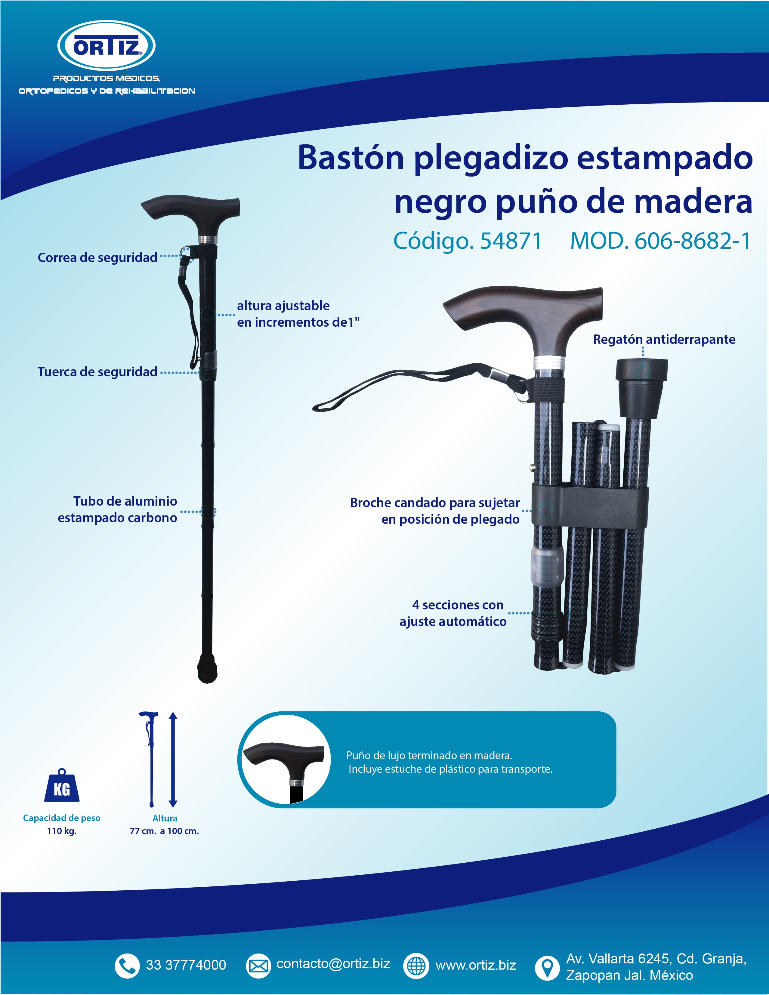 Este elegante bastón plegadizo de la marca Ortiz es el complemento perfecto para tu estilo. Con un mango de madera y material de aluminio, es resistente y ligero al mismo tiempo. Su longitud máxima de 94 cm y capacidad de soportar hasta 100 kg lo hacen ideal para cualquier ocasión. Además, su diseño extensible lo hace práctico y versátil para adaptarse a tus necesidades diarias. Atrévete a lucir sofisticado y seguro con este bastón Ortiz modelo 606-8682-1.