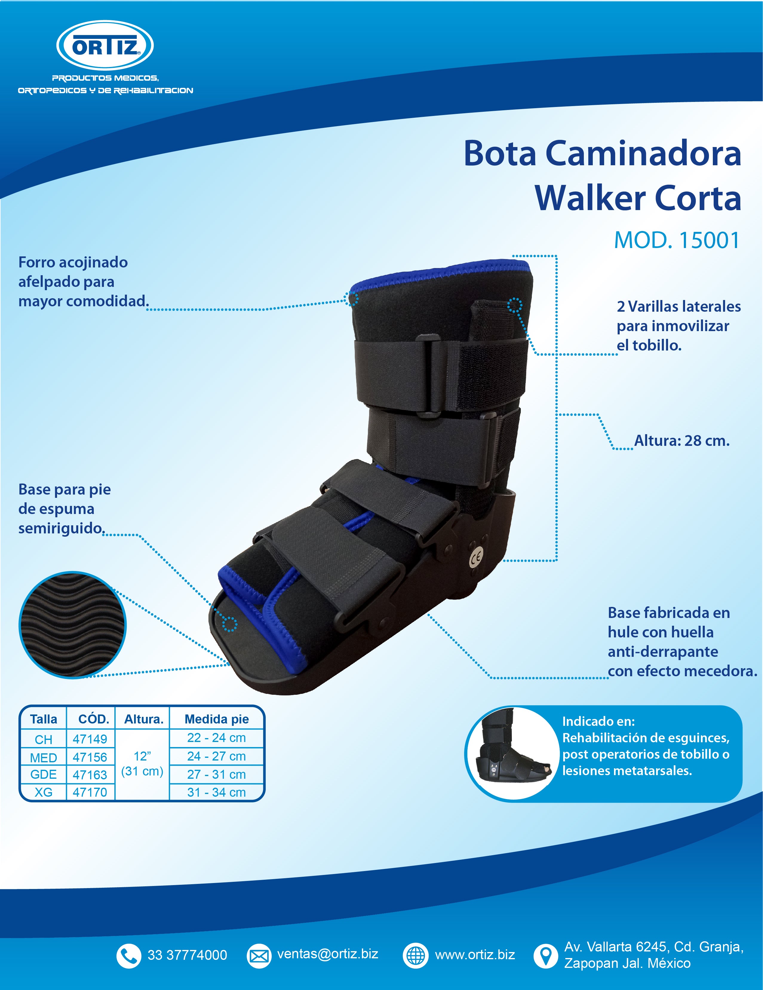 La bota larga tiene mayor soporte de tobillo que las cortas, si su lesión es de esguince de tobillo se recomienda mas la bota larga, si su lesión es en la parte del pie o dedos se recomienda la corta. La Bota Caminadora Walker Ortiz es ideal para adultos que buscan comodidad y estilo al caminar. Con un diseño en color negro y una altura de 36 cm, este modelo 15001 de la marca Ortiz es perfecto para cualquier ocasión. Su tipo de funda convencional garantiza un ajuste cómodo y seguro durante todo el día. Atrévete a darle un toque de elegancia a tus outfits con estas botas caminadoras de alta calidad.