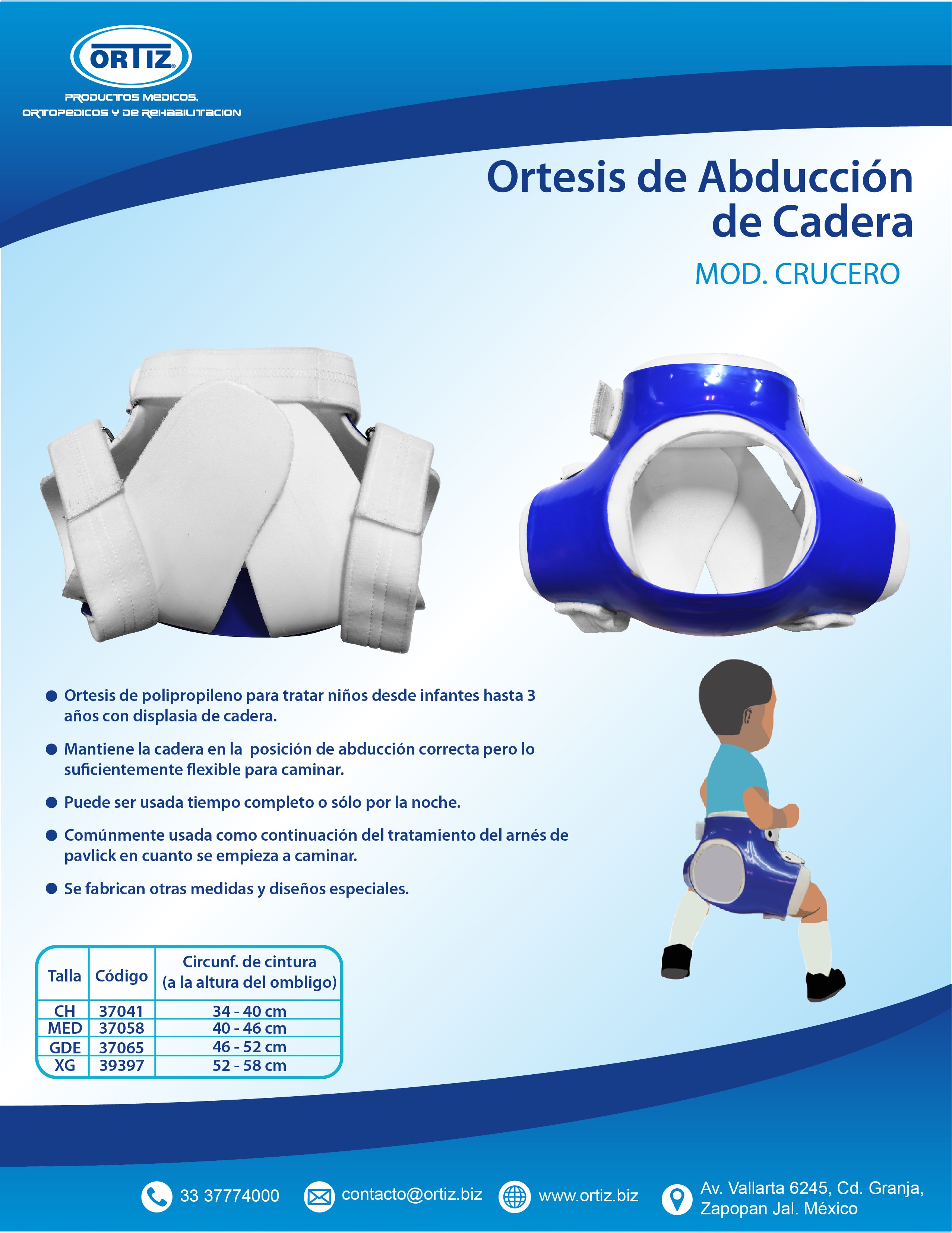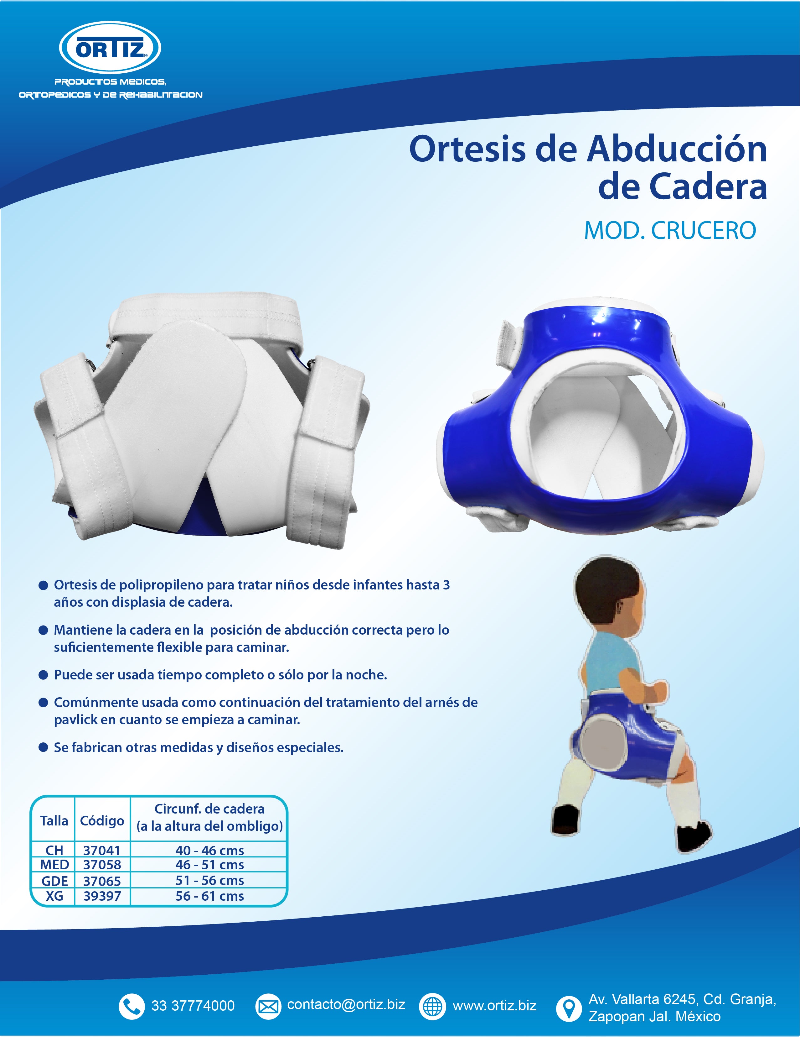 ¿Por qué usar una férula de abducción de cadera conocida como Rhino, Crucero ó Milgram? La férula de abducción de cadera se usa para tratar el problema de cadera de su hijo ya que la sostiene en una posición “abducida”; es decir, separada y flexionada. El médico de su hijo le informará cómo usar la férula. Esta puede producir enrojecimiento leve de la piel, pero no le producirá daño a su hijo si la usa de la forma en que le indicó el médico. ¿Cómo se usa la férula?