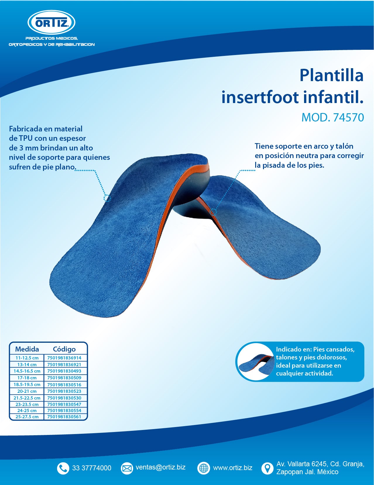 La plantilla pie plano Insert Foot de la marca Ortiz está diseñada para corregir la pisada y mejorar el arco del pie. Su material de TPU y su espesor de 3 mm brindan un alto nivel de soporte para quienes sufren de pie plano, pie pronador o genu valgo. Además, es anatómica y recortable para adaptarse a diferentes tipos de calzado. Con un tipo de arco alto, esta plantilla es ideal para niños y adultos que buscan una solución efectiva para sus problemas de pisada. Su modelo 74570 garantiza una corrección adecuada y un ajuste cómodo en el calzado. Recomendada para uso diario o laboral, esta plantilla ofrece un soporte firme y duradero para aliviar molestias y prevenir lesiones. La cantidad de pares incluida es de 1, lo que permite utilizarla en un solo par de zapatos o zapatillas. Su versatilidad la convierte en una opción práctica y económica para quienes necesitan un tratamiento para sus patologías de pie. No esperes más y prueba la plantilla pie plano Insert Foot para experimentar una pisada más saludable y confortable.