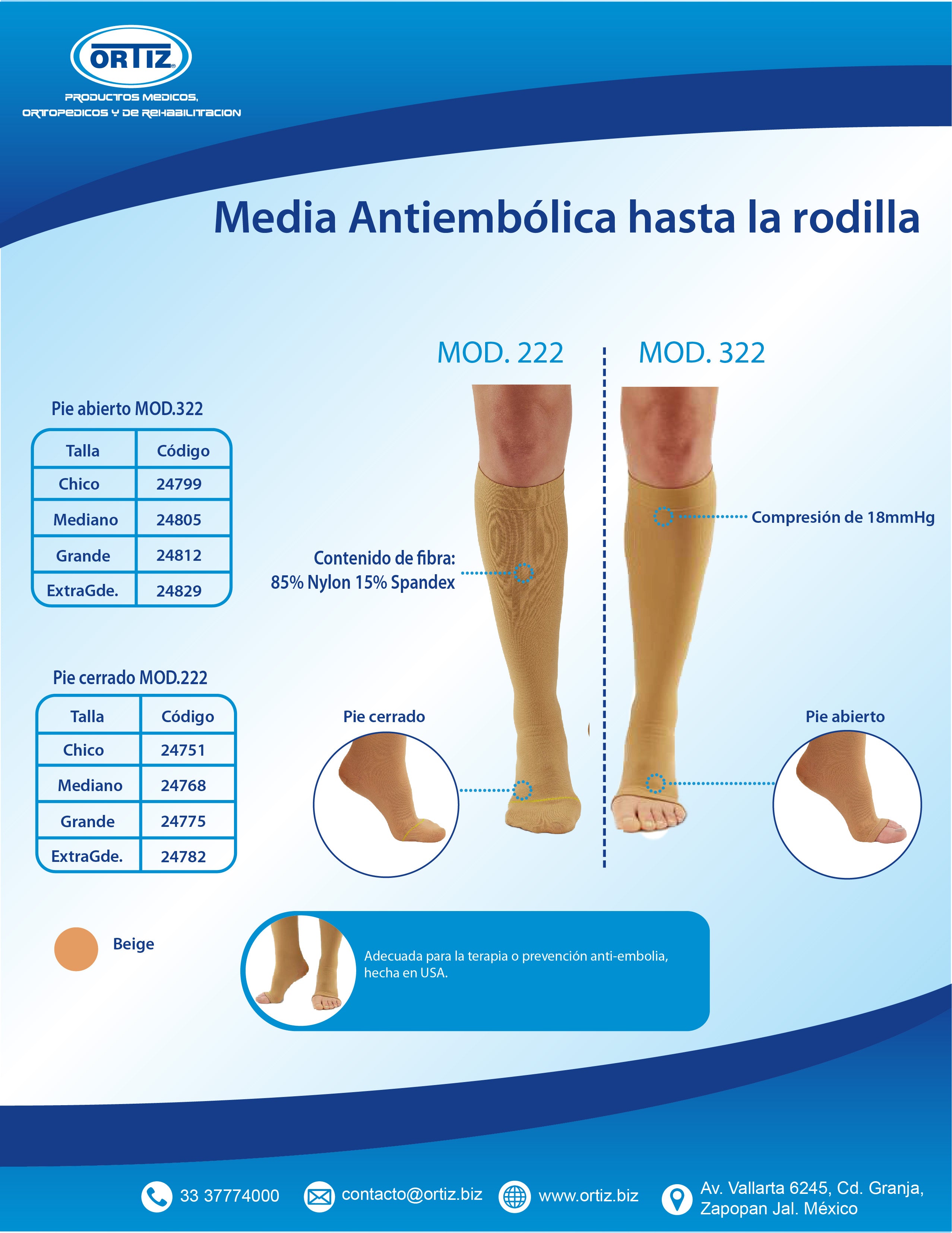 Media Antiembolica Rodilla Pie Abierto Med Compresion 18mmhg MOD. 322