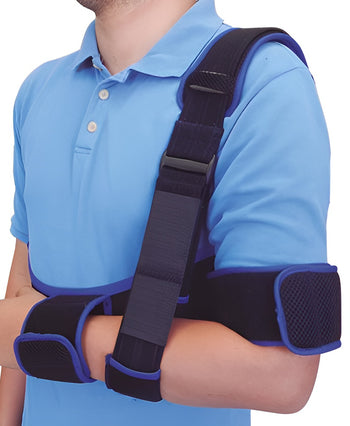 - Inmoviliza el hombro en abducción y rotación interna a través de las mangas de brazo y antebrazo,