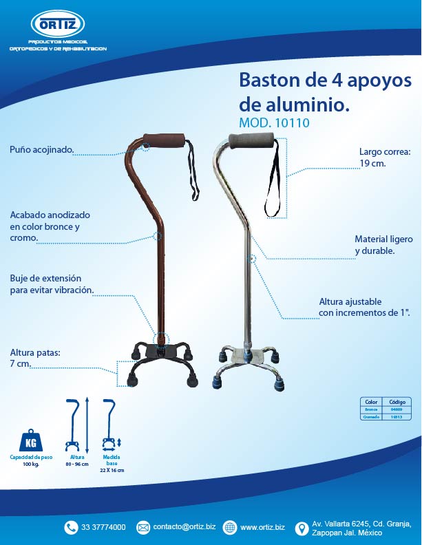 El bastón 4 apoyos Ortiz es el aliado perfecto para caminar con seguridad y comodidad. Fabricado en aluminio resistente, este bastón es ajustable en altura para adaptarse a tus necesidades. Con un peso máximo soportado de 100 kg, te brinda estabilidad y confianza en cada paso que des. Su mango de espuma garantiza un agarre firme y cómodo durante su uso. El modelo 10110 de Ortiz es extensible, pudiendo alcanzar un largo máximo de 87 cm para adaptarse a diferentes alturas. Sus 4 apoyos brindan una mayor estabilidad al caminar, reduciendo el riesgo de caídas y lesiones. Ideal para personas mayores, con movilidad reducida o en proceso de rehabilitación, este bastón es una herramienta indispensable para mejorar la calidad de vida. Ya sea para uso diario o para momentos de mayor actividad física, el bastón 4 apoyos Ortiz te brinda la seguridad y confianza que necesitas. Su diseño cromado le otorga un aspecto elegante y moderno, combinando funcionalidad y estilo en un solo producto. No esperes más y adquiere tu bastón Ortiz para caminar con tranquilidad y confort en todo momento.