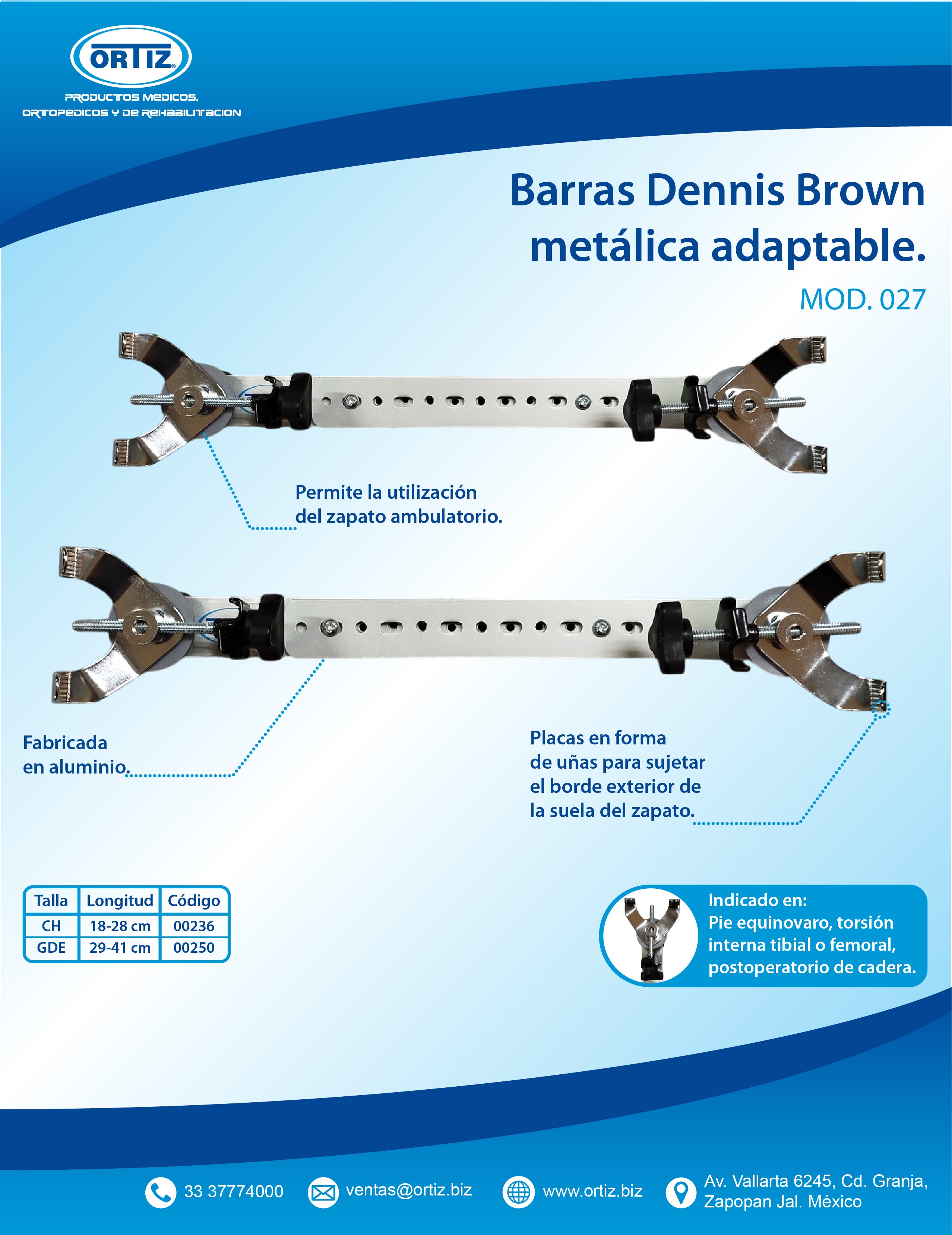 OJO: Úselos solo con calzado ortopédico de suela de baqueta que tenga borde salido en la orilla para que se agarren ahí las cuñas de la barra, cualquier otro tipo no se sujetara correctamente. Forma de elegir talla, medir ancho de los hombros del niño, la ferula debe colocar los pies a la misma distancia de los hombros, es decir cada pie debe quedar abajo de cada hombro.