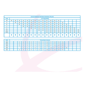 Para Saber su talla, primer identifique su talla de brassiere "Numero y Letra" despues utilice la tabla de medidas de la segunda foto, y busque arriba el cruce de su letra y numero de brassier y baje en la tabla hasta encontrar el renglón que pertenece a la prótesis 509, ese será su numero de prótesis a comprar.