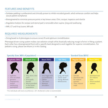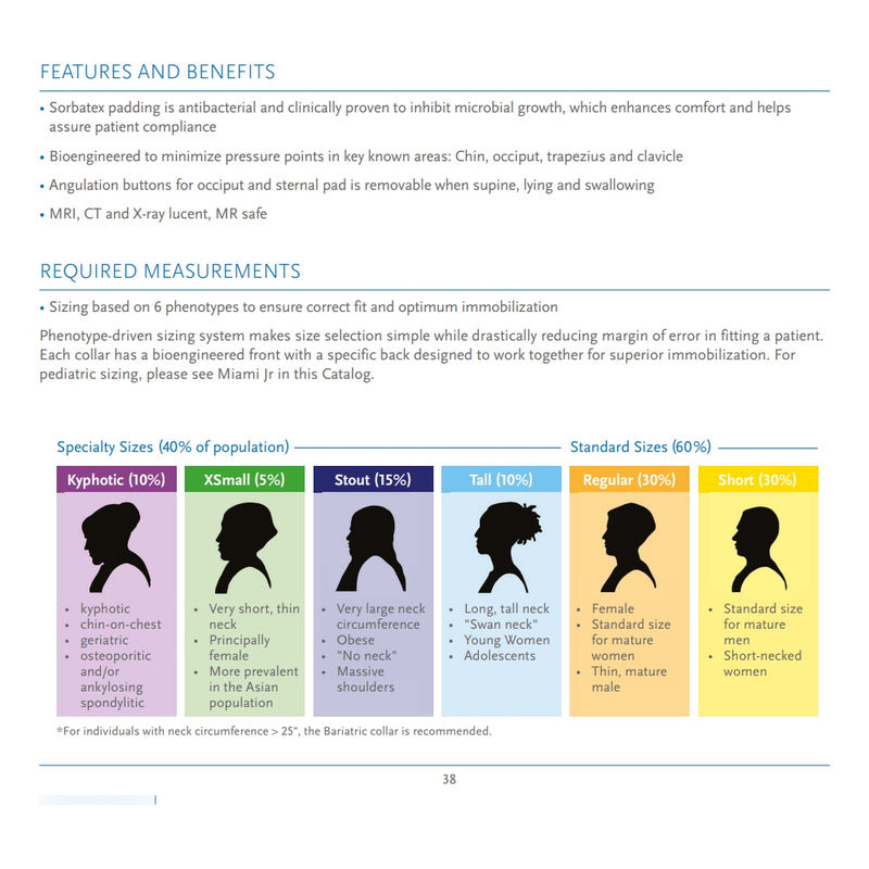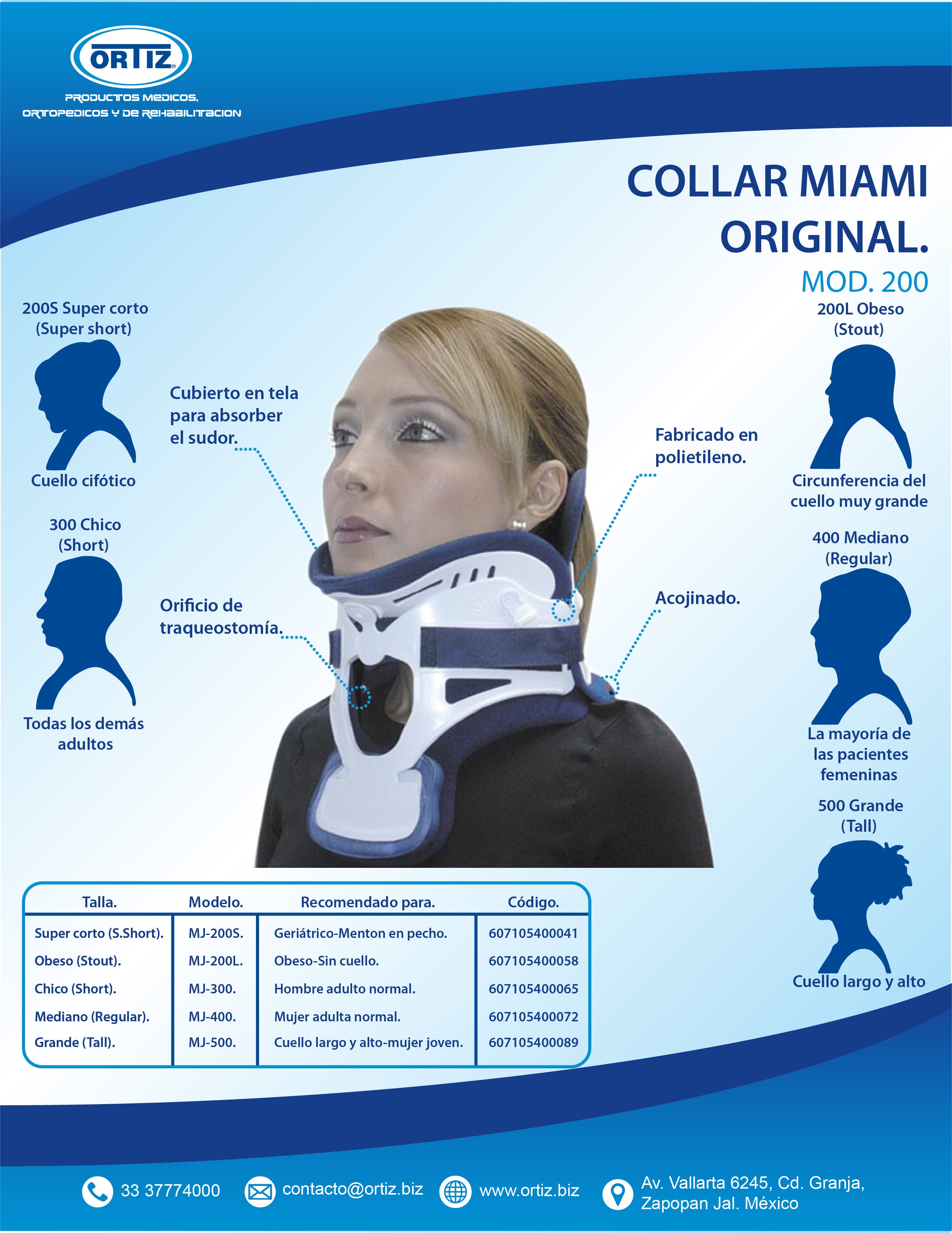 INSTRUCCIONES GENERALES DE SEGURIDAD. El profesional sanitario debe informar al paciente sobre todo lo que se indica en este documento y que sea necesario para el uso seguro de este dispositivo. Todo incidente grave relacionado con el dispositivo debe ser informado al fabricante y a las autoridades pertinentes. El paciente debe comunicarse de inmediato con un profesional sanitario: • Si se produce un cambio o pérdida de funcionalidad del dispositivo, o si el dispositivo muestra signos de daño o desgaste que impidan su funcionamiento normal. • Si se produce dolor, irritación de la piel o reacción inusual con el uso del dispositivo. El dispositivo es para un solo paciente, uso múltiple. INSTRUCCIONES DE AJUSTE. Selección de tallas Las tallas del collar Miami J se basan en el fenotipo. Para determinar la talla de collar adecuada, identifique el fenotipo de su paciente según las siluetas de tallas (vea la foto en nuestra publicación) y las preguntas simples sobre tallas que aparecen a continuación.