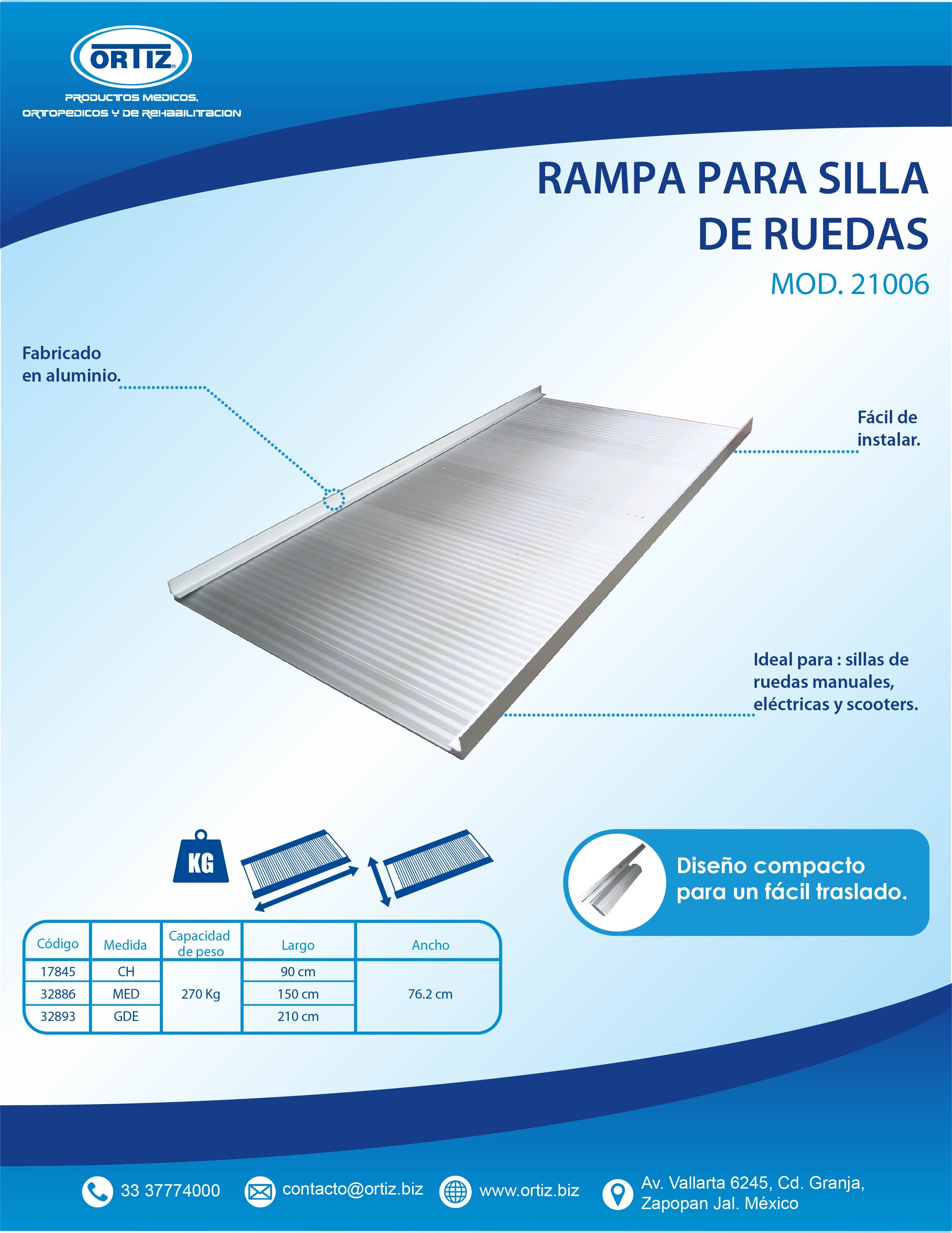 La Rampa Ortiz es la solución perfecta para facilitar el acceso a sillas de ruedas, motos o bicicletas. Con una capacidad máxima de peso de 200 kg, esta rampa de aluminio es resistente y duradera. Con dimensiones de 90 cm de largo y 76 cm de ancho, es ideal para diferentes tipos de usuarios. Su diseño compacto y ligero la hace fácil de transportar y almacenar. Gracias a su construcción de alta calidad, la Rampa P Ortiz garantiza seguridad y estabilidad al momento de utilizarla. Su modelo 21006 ofrece una superficie antideslizante para mayor protección. Además, su diseño versátil permite su uso en diferentes entornos y situaciones. Con esta rampa, podrás disfrutar de mayor independencia y movilidad en tu día a día.