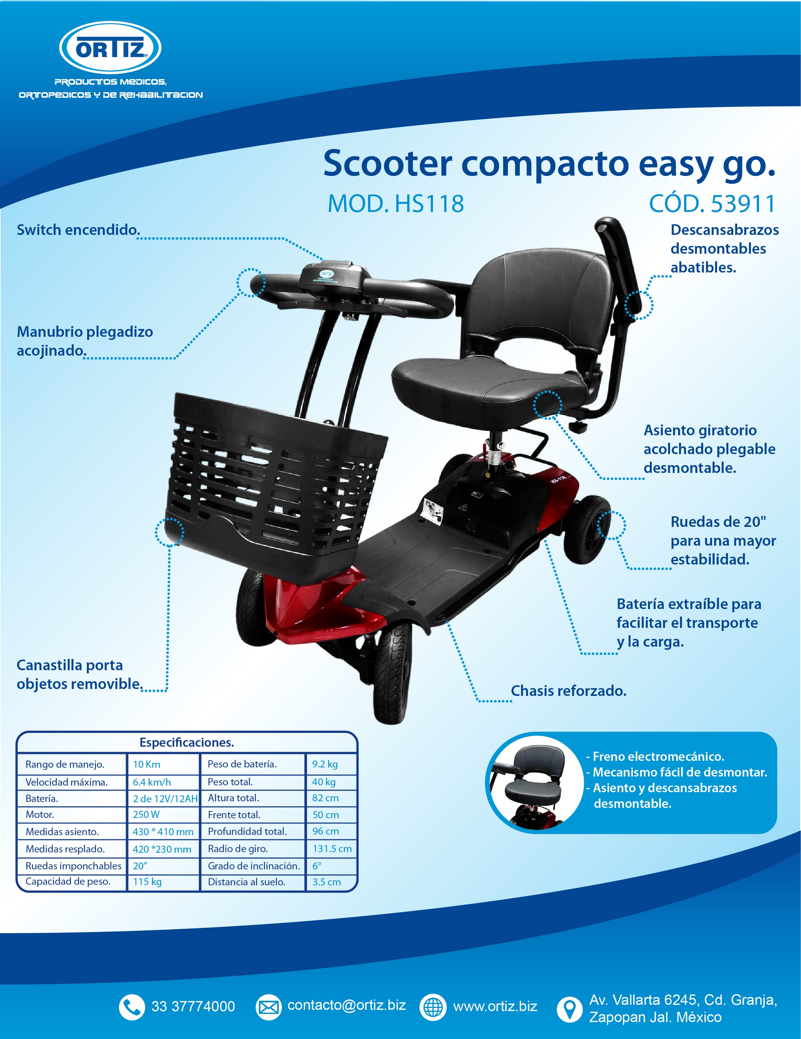 La Silla Eléctrica Scooter Compacto Económico 250W de la marca Ortiz, modelo HS118, es la solución ideal para quienes buscan movilidad y comodidad. Con un diseño práctico y funcional, esta silla motorizada cuenta con un motor potente de 250W que permite alcanzar una velocidad máxima de 6.4 km/h, facilitando el desplazamiento en diferentes entornos. Su estructura robusta, con un peso de 40 kg, ofrece estabilidad y seguridad. El asiento tiene un ancho de 43 cm y el respaldo, de 42 cm, brindan un soporte adecuado para el usuario. Aunque no es plegable, su diseño compacto permite un fácil manejo en espacios reducidos. Equipado con una batería de 12V y una potencia de 125W, este scooter garantiza un rendimiento eficiente para el uso diario. Además, incluye una canastilla que proporciona un espacio adicional para llevar objetos personales, mejorando la experiencia de movilidad. Ideal para adultos que requieren asistencia en su desplazamiento, la Silla Eléctrica Scooter Compacto es una opción accesible y funcional. Su diseño no deportivo y su altura total de 82 cm la hacen adecuada para diversas situaciones, asegurando que cada usuario pueda disfrutar de una mayor independencia y libertad de movimiento.