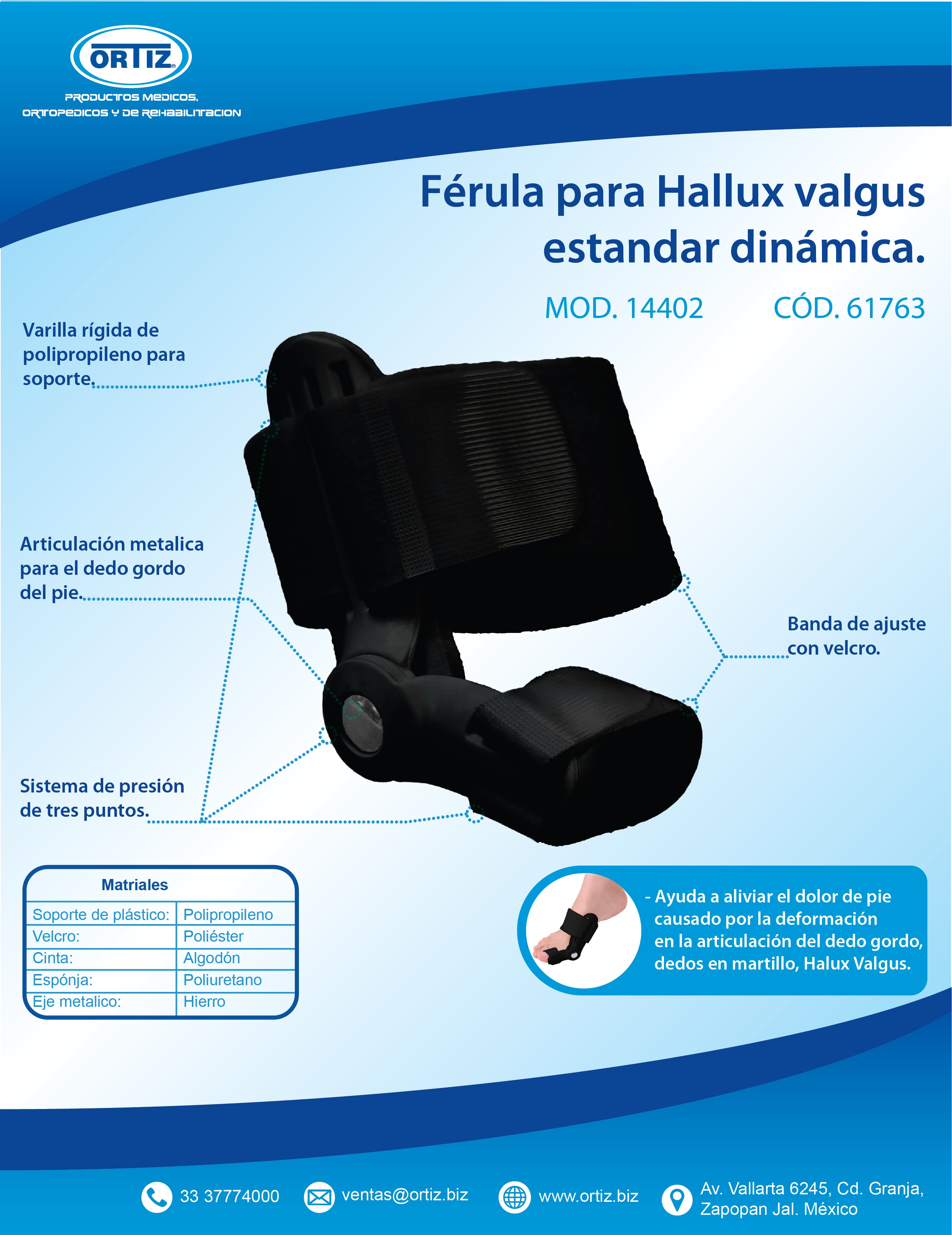 La férula para Hallux Valgus estándar dinámica de la marca Otiz (modelo 14402) es la solución ideal para quienes buscan un método efectivo para la corrección de juanetes y dedos en martillo. Diseñada para adaptarse tanto al pie derecho como al izquierdo, esta férula es ajustable, lo que permite un mayor confort y personalización en su uso. Fabricada con materiales de alta calidad, incluye un soporte de plástico de polipropileno que aporta resistencia y durabilidad. Su sistema de fijación de Velcro de poliéster y la suave cinta de algodón, combinada con esponja de poliuretano, garantizan una experiencia cómoda durante todo el día, mientras que el eje metálico de hierro asegura la estabilidad necesaria para una efectiva corrección. Ideal para personas que pasan largas horas de pie o que sufren de molestias en los pies, esta férula se presenta como una opción práctica y fácil de usar. Su diseño ergonómico permite una mayor movilidad sin sacrificar el soporte, lo que la convierte en una herramienta esencial para tu cuidado podológico diario. Transforma tu bienestar con la férula para Hallux Valgus de Otiz, y disfruta de pies más saludables y cómodos. La corrección de tus problemas en los pies es más fácil y accesible con este producto especializado.
