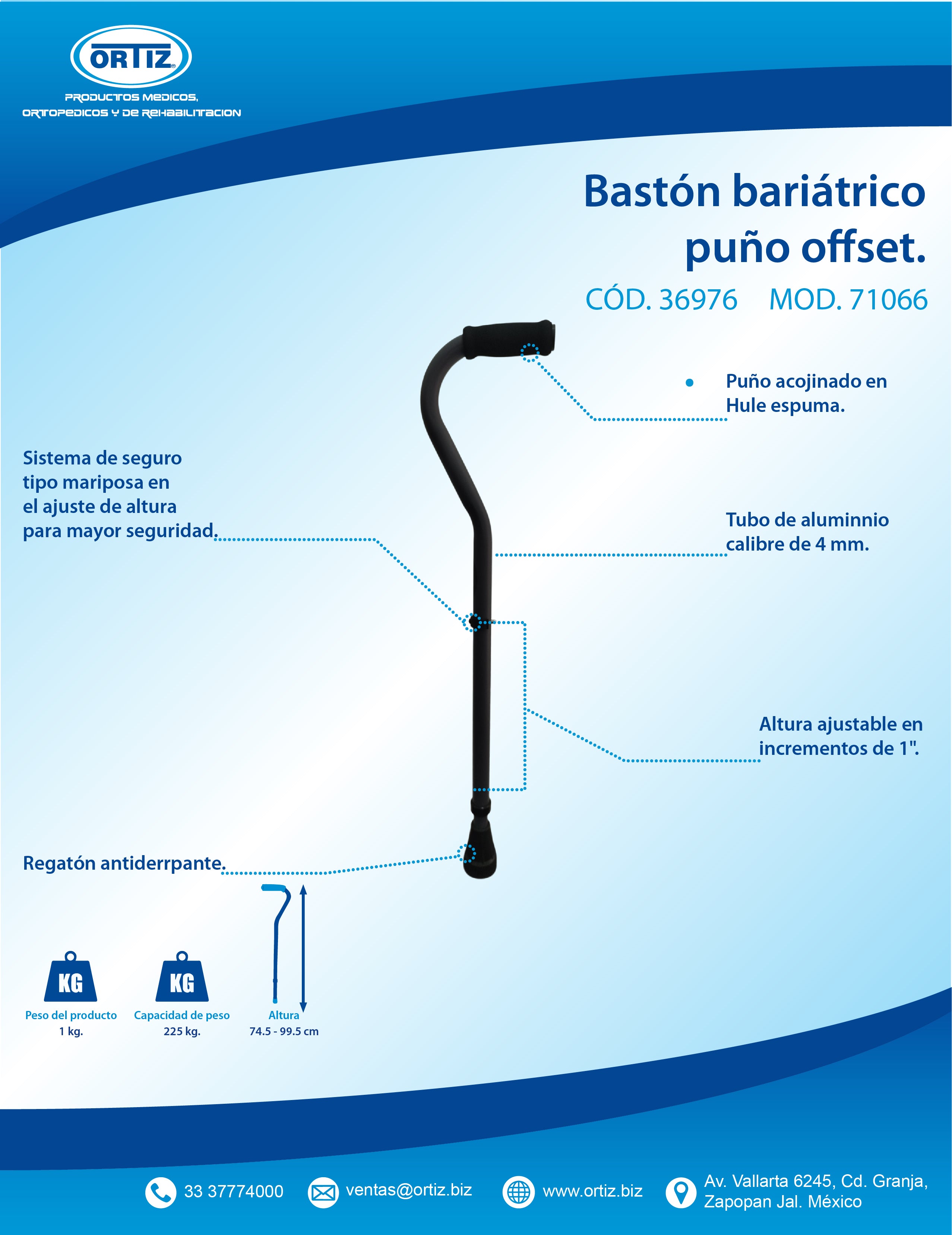 El bastón bariátrico puño offset Ortiz es la solución ideal para quienes buscan seguridad y comodidad en su movilidad diaria. Su estructura de aluminio le confiere ligereza y resistencia, permitiendo soportar un peso máximo de hasta 225 kg, lo que lo convierte en una opción confiable para usuarios con necesidades especiales. Este modelo incluye un mango de espuma que proporciona un agarre cómodo y antideslizante, optimizando la estabilidad en cada paso. Con una longitud máxima de 99 cm y su capacidad extensible, el bastón se adapta fácilmente a diferentes alturas, brindando soporte personalizado. Aunque no es plegable, su diseño robusto asegura una durabilidad prolongada, ideal para un uso diario. Además, su estilo moderno y funcionalidad hacen de este bastón una herramienta indispensable para quienes requieren asistencia en su movilidad, mejorando su calidad de vida y promoviendo la independencia.