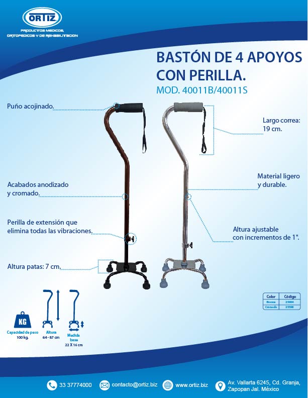 El Bastón de 4 apoyos con perilla Ortiz es la solución ideal para quienes buscan estabilidad y seguridad en su movilidad diaria. Con un diseño práctico y robusto, este bastón está fabricado en aluminio, garantizando una resistencia notable y un peso máximo soportado de hasta 100 kg. Su mango acolchado con espuma proporciona una comodidad excepcional, permitiendo su uso prolongado sin causar molestias. Con una altura máxima de 87 cm, este bastón es extensible, lo que permite adaptarlo a la estatura del usuario para un manejo más ergonómico. Aunque no es plegable, su estructura fija le otorga la solidez necesaria para brindar un soporte confiable en cualquier situación. Es ideal para personas mayores o aquellas con dificultades de movilidad, aportando un elemento de seguridad en cada paso. La perilla del bastón está diseñada para ofrecer un agarre fácil y seguro, facilitando además la movilidad en diferentes tipos de superficies. Este producto es esencial para quienes buscan una herramienta que combine funcionalidad y confort. El Bastón de 4 apoyos con perilla Ortiz es el aliado perfecto para mejorar la calidad de vida de sus usuarios, brindando confianza y libertad en sus desplazamientos.