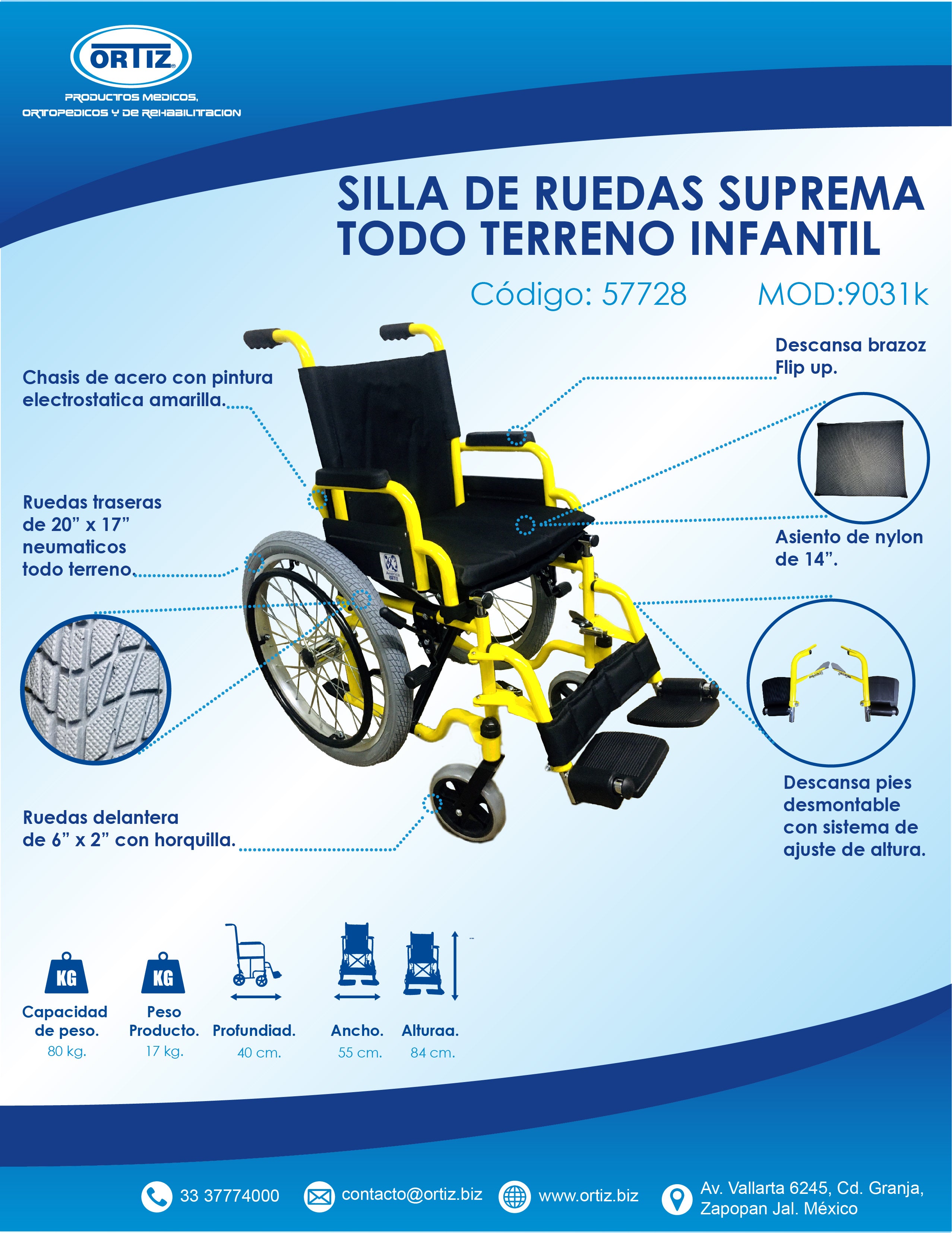 La Silla De Ruedas Infantil Todo Terreno Suprema 14 de la marca Ortiz es ideal para niños con movilidad reducida. Con un peso de 17 kg y una capacidad de carga de hasta 75 kg, esta silla manual es plegable para facilitar su transporte y almacenamiento. El ancho del respaldo de 36 cm y el ancho del asiento de 36 cm brindan comodidad y soporte a los pequeños usuarios. Con 4 ruedas y un diseño deportivo, esta silla ofrece estabilidad y estilo a la vez. Con una altura total de 84 cm, la Silla De Ruedas Infantil Todo Terreno Suprema 14 modelo 9031K es una excelente opción para que los niños puedan moverse con libertad y seguridad en cualquier tipo de terreno. ¡Hazte con la tuya y brinda a tu hijo la movilidad que se merece!.
