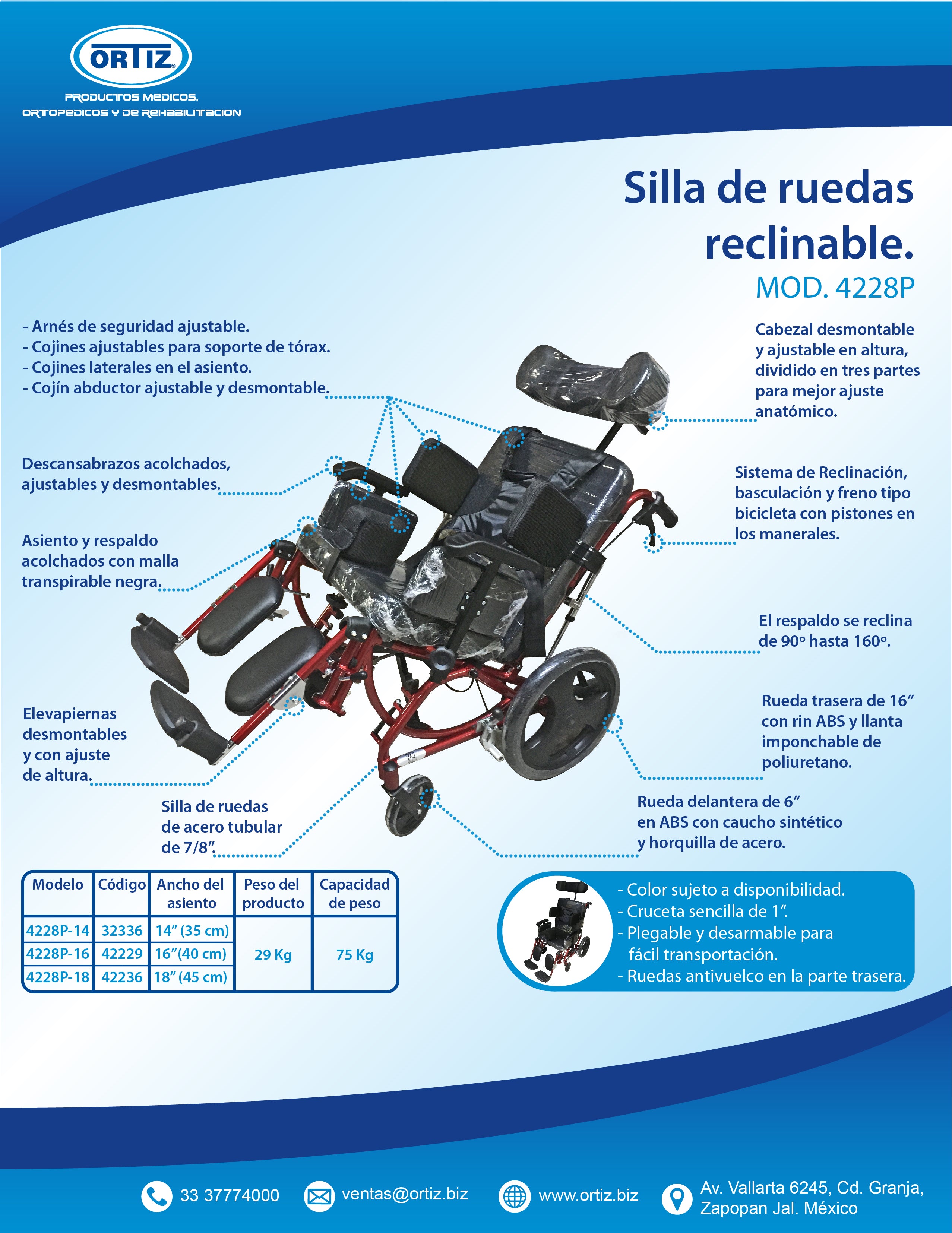 La silla de ruedas PCI reclinable cama de la marca Ortiz es una excelente opción para aquellos que buscan comodidad y funcionalidad. Con accesorios incluidos como cabecera, cojines laterales y elevapiernas desmontable, esta silla ofrece un soporte completo para el usuario. Además, su diseño plegable la hace fácil de transportar y almacenar en espacios reducidos. Gracias a su capacidad de reclinación y postura, esta silla de ruedas es ideal para garantizar el confort y bienestar del usuario. Con un ancho de respaldo de 41 cm y un peso máximo soportado de 60 kg, es una opción segura y resistente. Su diseño pediátrico la hace perfecta para niños que necesitan movilidad y descanso adecuados. El modelo 4228 cuenta con un ancho de asiento de 36 o 41 cms segun modelo y una cantidad de ruedas de 4, lo que proporciona estabilidad y facilidad de movimiento. A pesar de ser una silla de ruedas manual, su calidad y durabilidad la convierten en una excelente inversión a largo plazo. No esperes más y adquiere esta silla de ruedas PCI reclinable cama para mejorar la calidad de vida de tus seres queridos.