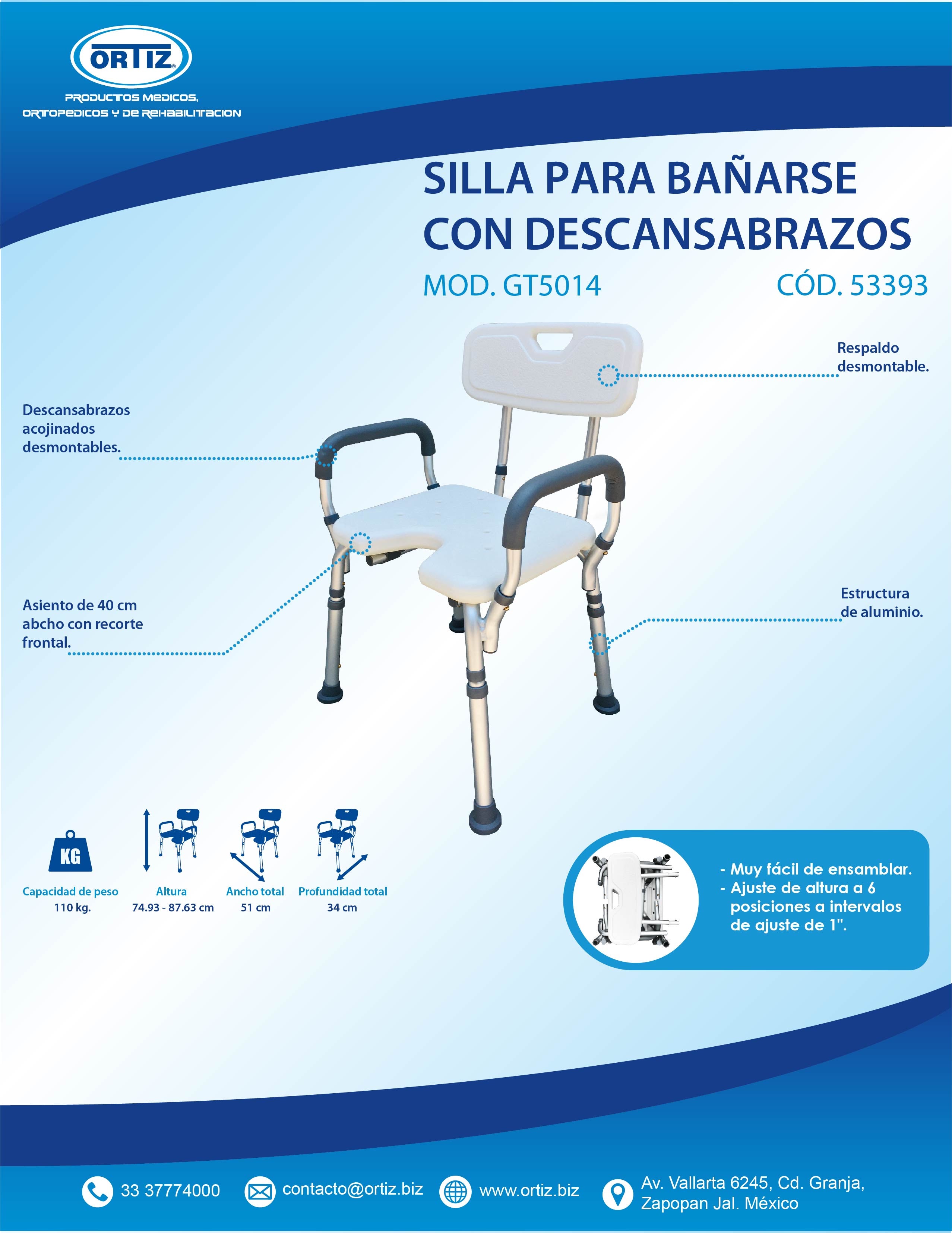 La silla de ducha Ortiz GT5014 es ideal para brindar comodidad y seguridad a personas con movilidad reducida. Con un peso máximo soportado de 120 kg, esta silla garantiza estabilidad y resistencia durante su uso. Además, su estructura de aluminio y diseño ergonómico con respaldo y apoyabrazos proporcionan un mayor confort al usuario. El asiento ajustable y la bandeja de contención hacen que esta silla sea práctica y funcional para su uso en la ducha. Su tamaño compacto de 34 cm de profundidad, 87 cm de altura y 51 cm de ancho la hacen perfecta para adaptarse a espacios reducidos. Además, su peso ligero de 4 kg facilita su transporte y almacenamiento sin complicaciones. Con la silla de ducha Ortiz GT5014, podrás disfrutar de una experiencia segura y cómoda en la ducha. Su diseño robusto y funcionalidad la convierten en una excelente opción para mejorar la calidad de vida de personas con necesidades especiales. ¡No esperes más y adquiere la tuya hoy mismo!
