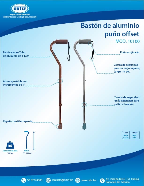 El Bastón Aluminio Puño Ganso Offset Adulto Ortiz es la solución ideal para quienes buscan un apoyo seguro y confiable en su movilidad diaria. Fabricado en aluminio ligero, este bastón combina resistencia y durabilidad, soportando hasta 100 kg de peso. Su diseño con puño de espuma proporciona un agarre cómodo, reduciendo la fatiga en las manos durante su uso prolongado.