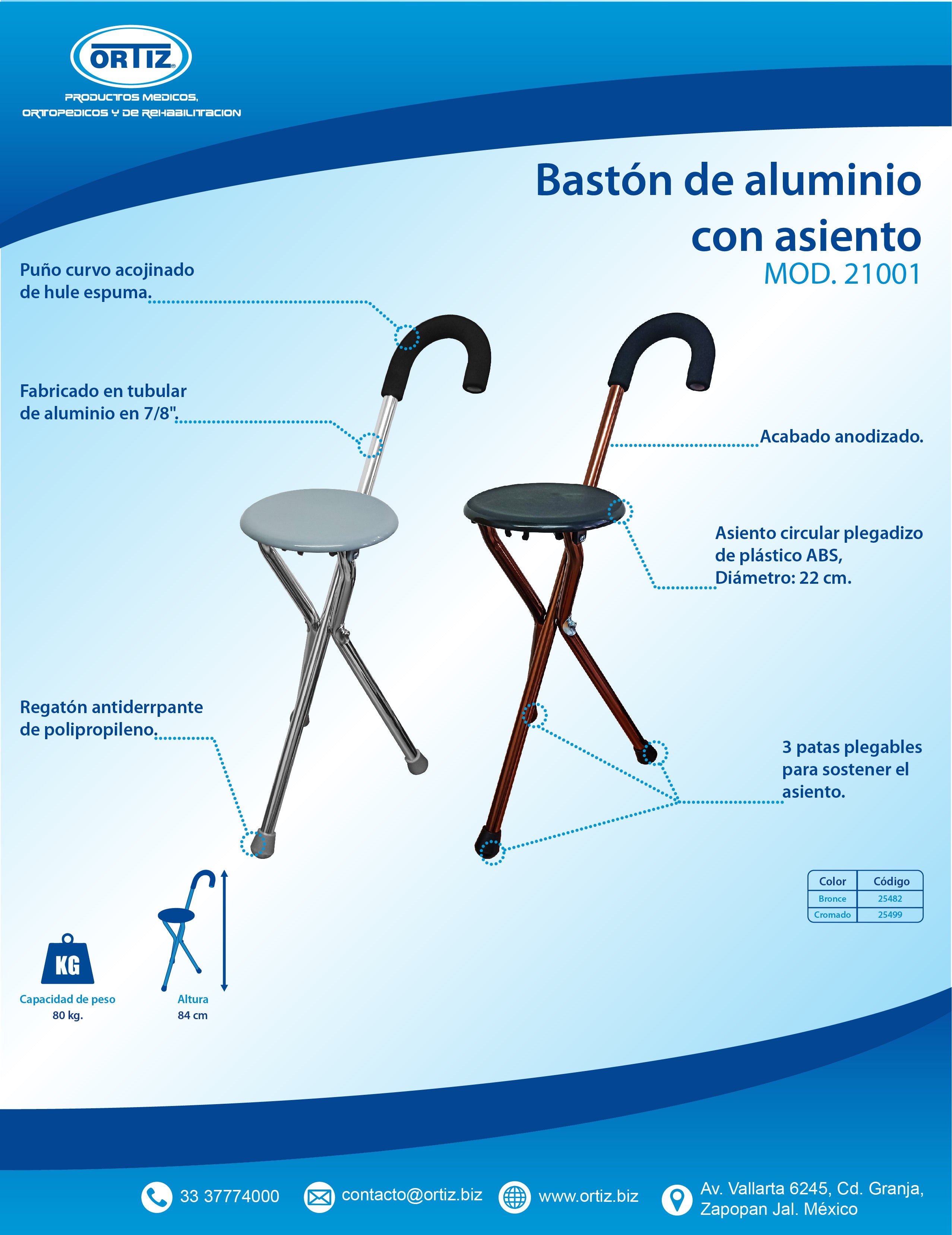 El Bastón Aluminio Tripie con Asiento Adulto Ortiz es una opción ideal para quienes buscan comodidad y seguridad en sus desplazamientos. Fabricado en aluminio ligero, combina resistencia y durabilidad, permitiendo un uso prolongado sin sacrificar la facilidad de manejo. Su mango de espuma ofrece un agarre confortable, brindando mayor seguridad en cada paso. Este bastón no es extensible ni plegable, lo que garantiza una estructura estable y robusta que soporta hasta 80 kg. Su diseño en tripie proporciona un soporte firme, permitiendo al usuario descansar en cualquier momento gracias a su asiento incorporado. Es perfecto para actividades al aire libre, paseos o para aquellos que necesitan una ayuda adicional en su movilidad diaria. El modelo 21001 combina funcionalidad y diseño atractivo, convirtiéndose en un accesorio práctico para personas mayores o con movilidad reducida. Al elegir el Bastón Aluminio Tripie con Asiento Adulto Ortiz, te aseguras de tener un compañero confiable en tus actividades cotidianas, mejorando tu calidad de vida y proporcionando la tranquilidad que necesitas.