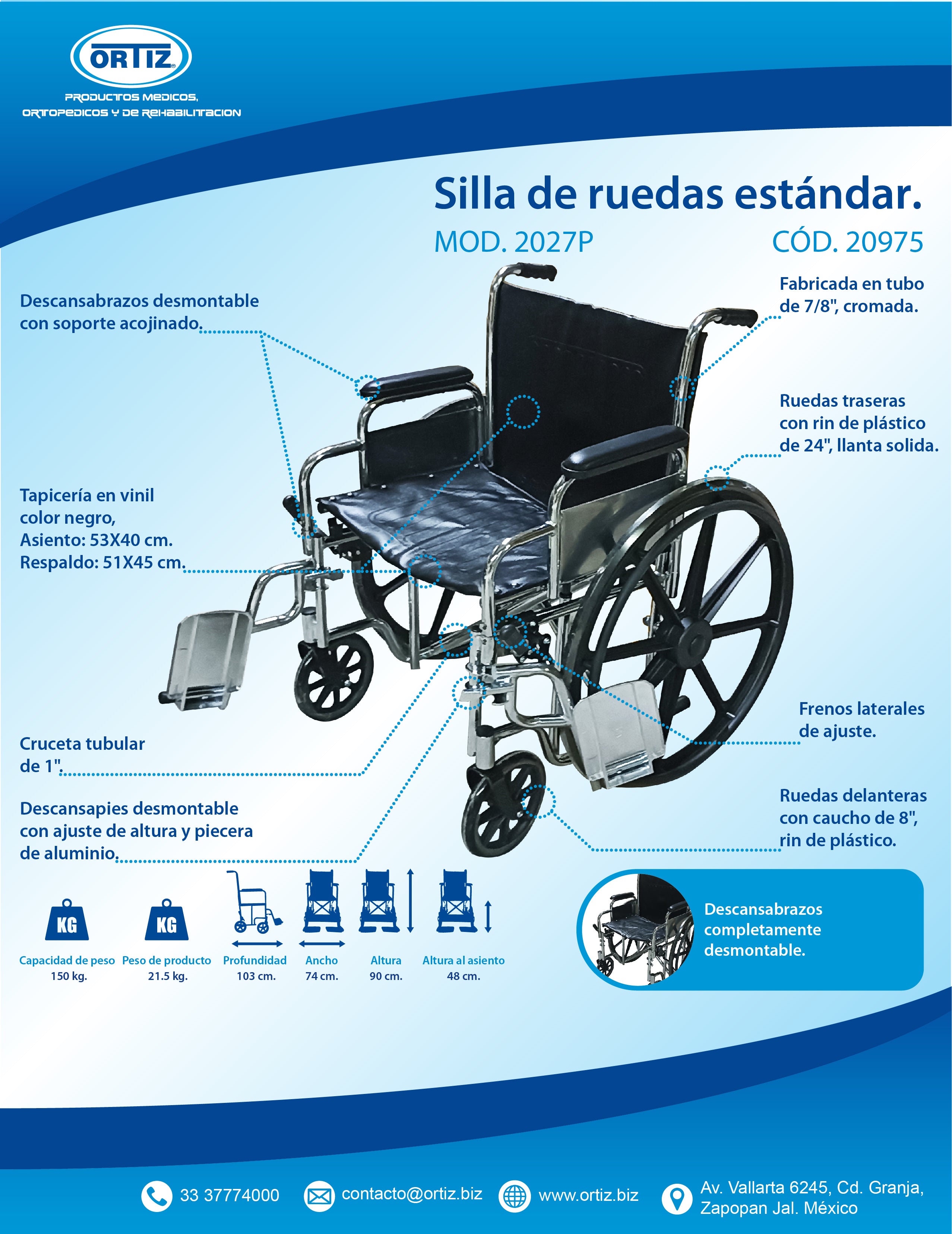 La silla de ruedas manual Ortiz modelo 2027P es una opción ideal para quienes buscan comodidad y funcionalidad. Con un ancho de asiento de 53 cm y un respaldo de 51 cm, esta silla está diseñada para ofrecer un soporte adecuado y un ajuste perfecto para el usuario. Su estructura plegable permite un fácil almacenamiento y transporte, facilitando la movilidad en diferentes entornos. Con un peso total de 21.5 kg, esta silla es robusta y resistente, soportando hasta 150 kg. Las ruedas de alta calidad garantizan una experiencia de desplazamiento suave y segura, mientras que la piecera y los brazos desmontables brindan versatilidad y comodidad al usuario. Esta característica es especialmente útil para facilitar el acceso y la transferencia. El diseño de la silla no es deportivo ni reclinable, lo que la hace adecuada para un uso diario y práctico. Su altura total de 90 cm asegura que se adapte a diversas situaciones, permitiendo un uso eficiente en espacios reducidos. La Ortiz 2027P es una opción confiable para quienes buscan una silla de ruedas que combine funcionalidad y comodidad en su vida diaria.