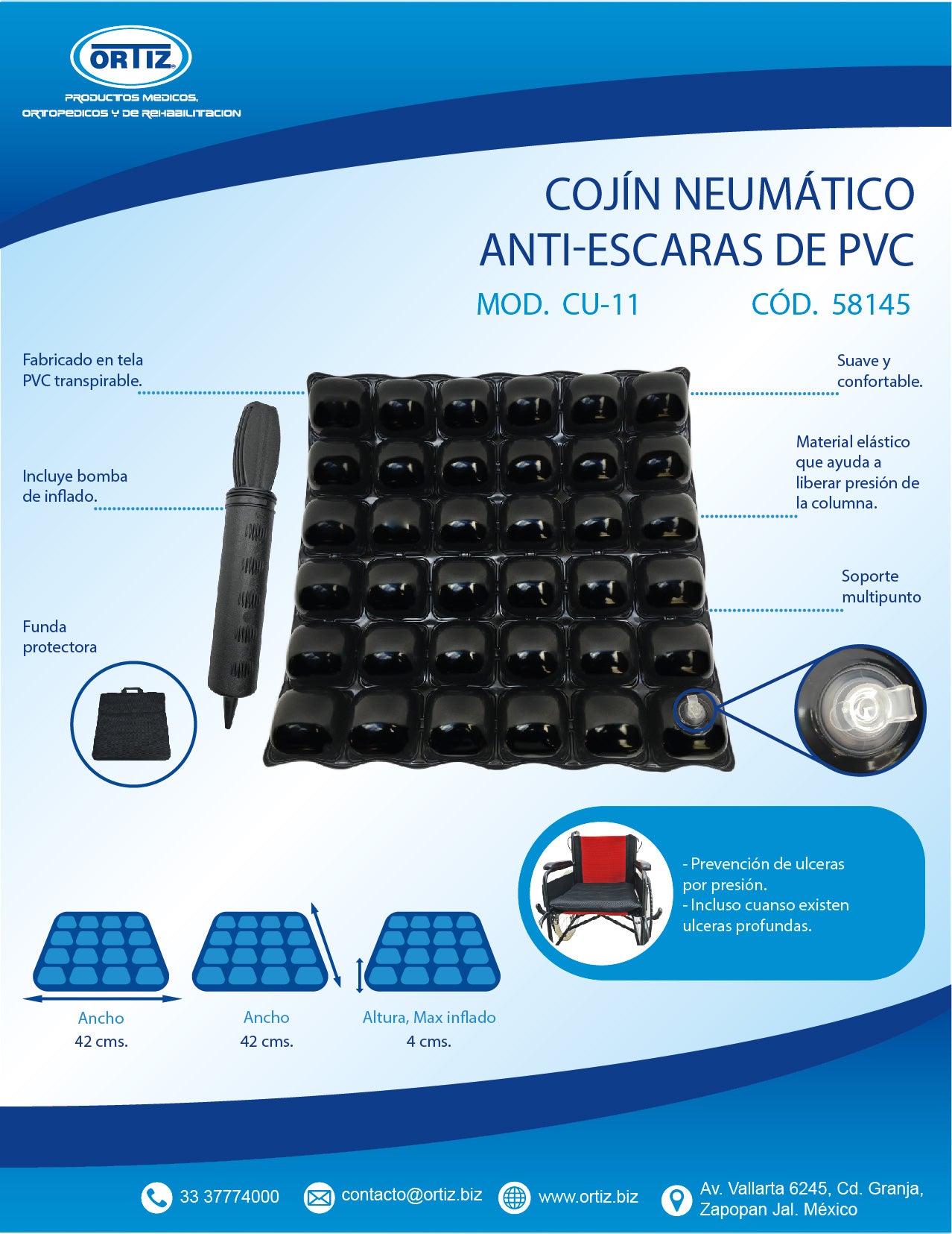 - Cojín neumático fabricado en tela PVC transpirable,