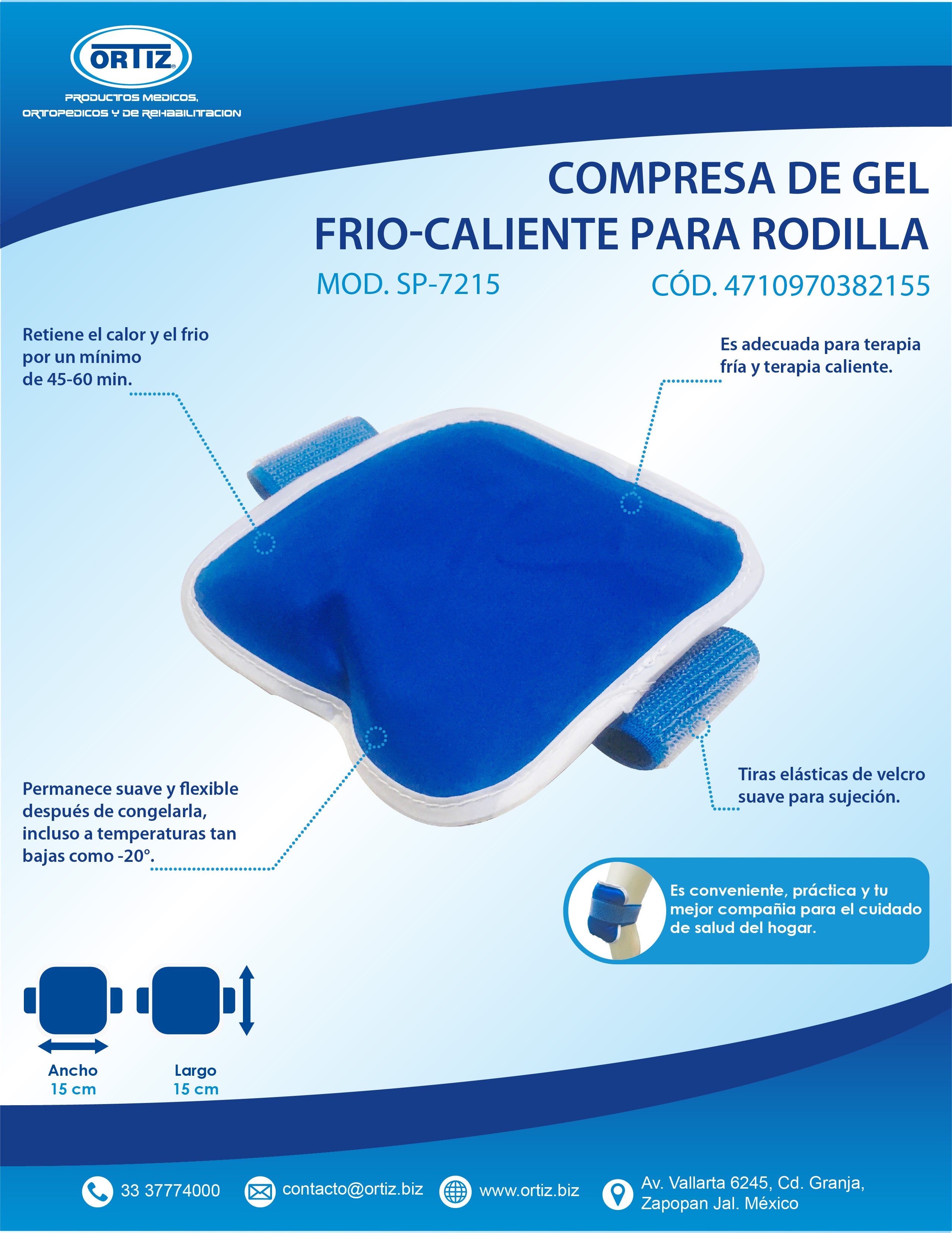 La Compresa de Gel Frío-Caliente para rodilla Ortiz es la solución ideal para quienes buscan un alivio efectivo y versátil. Con unas dimensiones de 15 cm x 15 cm, este producto está diseñado específicamente para adaptarse a la forma de la rodilla, proporcionando un tratamiento focalizado para dolores e inflamaciones. Su acción térmica tanto fría como caliente permite tratar lesiones musculares, golpes y esguinces de manera sencilla y efectiva. Fabricada por la reconocida marca Ortiz, esta compresa es reutilizable y apta para calentar en microondas, ofreciendo así una opción práctica y económica. Su diseño garantiza comodidad y una perfecta sujeción, asegurando que se mantenga en su lugar mientras se usa. Con cada aplicación, experimentarás un bienestar inmediato que te ayudará a retomar tus actividades diarias. Ideal para deportistas, personas con estilo de vida activo o quienes sufren de molestias en la rodilla, esta compresa se convierte en un aliado imprescindible en tu hogar. Simplemente colócala en el microondas o refrigérala según tus necesidades, y disfruta de sus beneficios adaptados a cada situación. Lleva tu recuperación al siguiente nivel con la Compresa de Gel Frío-Caliente para rodilla Ortiz, un complemento esencial en el cuidado de tu salud.
