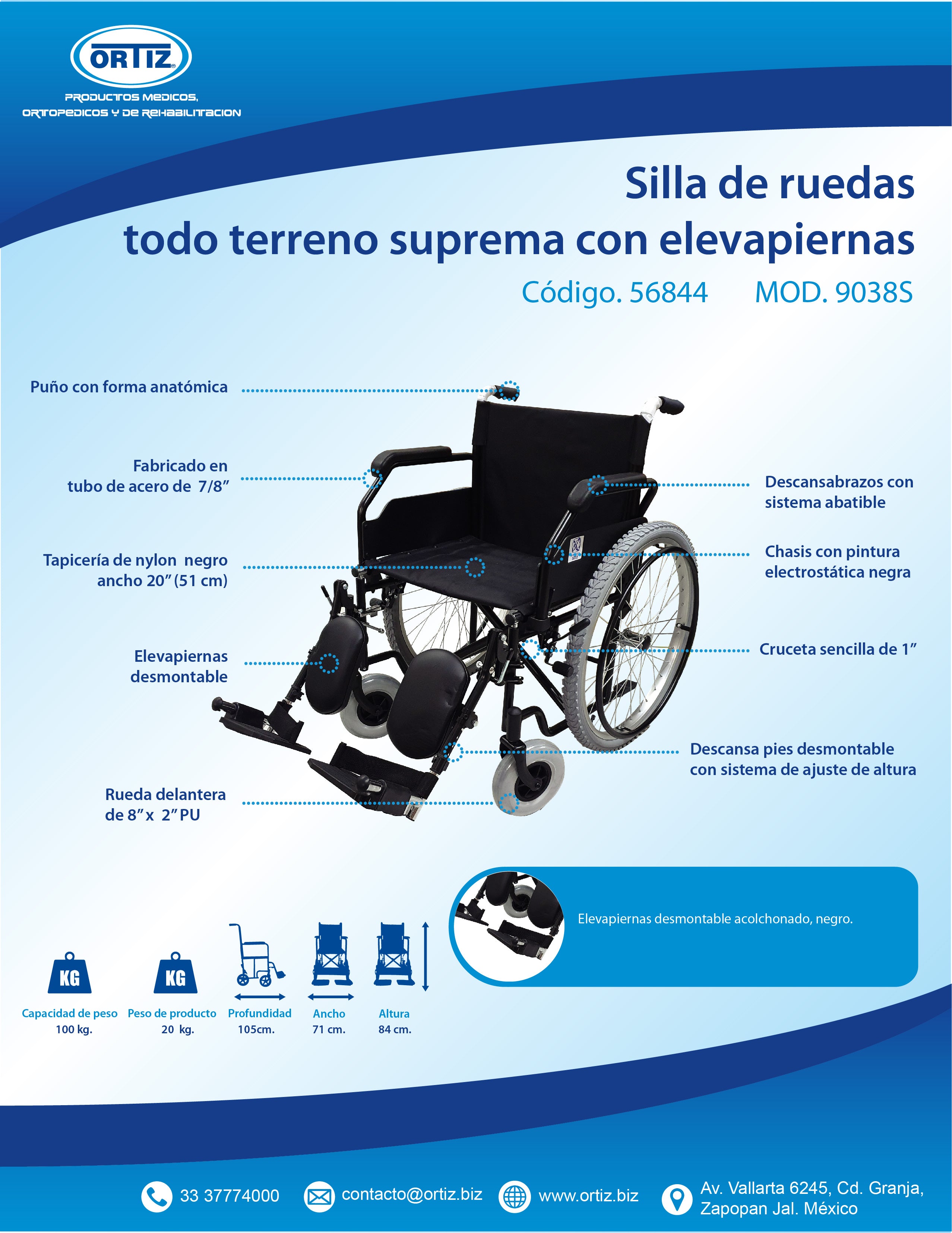 La Silla de ruedas suprema todo terreno con elevapiernas es ideal para personas que requieren un soporte resistente y seguro. Con un ancho de asiento de 51 cm brinda comodidad y estabilidad.